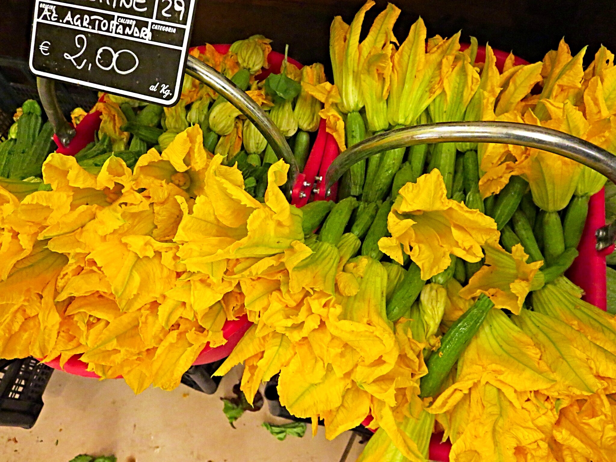 On our list are pomodori, peperoni, melanzane, ciliegie e vino, naturalmente. I admire the fiori di zucca and hope to have some fritta before I leave for home.