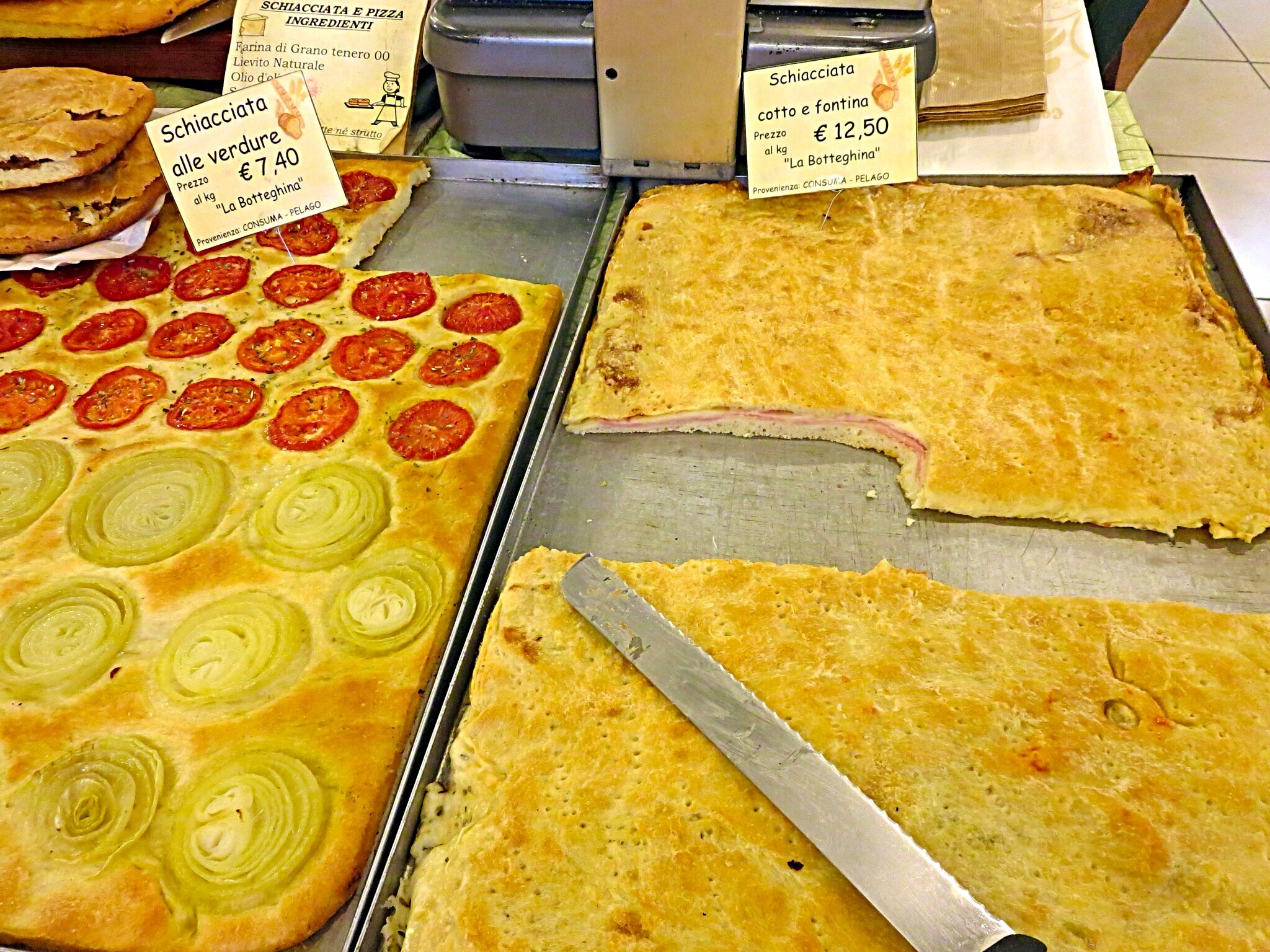 Once again, I hit the road this morning before eating anything, and cannot resist getting a slice of schiacciata cotte e fontina. Although I am too embarrassed to stuff my face with it at the moment, you will notice it comes in hand later.