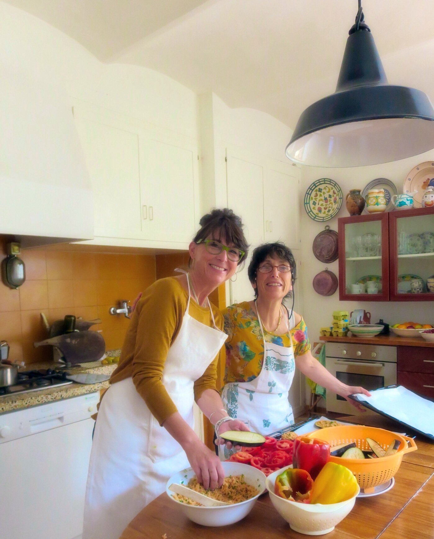 Constanza was surprised to notice we were ahead of schedule. This allowed us to go ahead and prepare the summer vegetables au gratin that are planned for dinner. (Yes, we are eating AGAIN after the ravioli!) As the four of us worked in the kitchen, Carla’s method was very direct. She would demonstrate a technique once, then hand over to me to complete. I felt trusted and one of the famiglia.