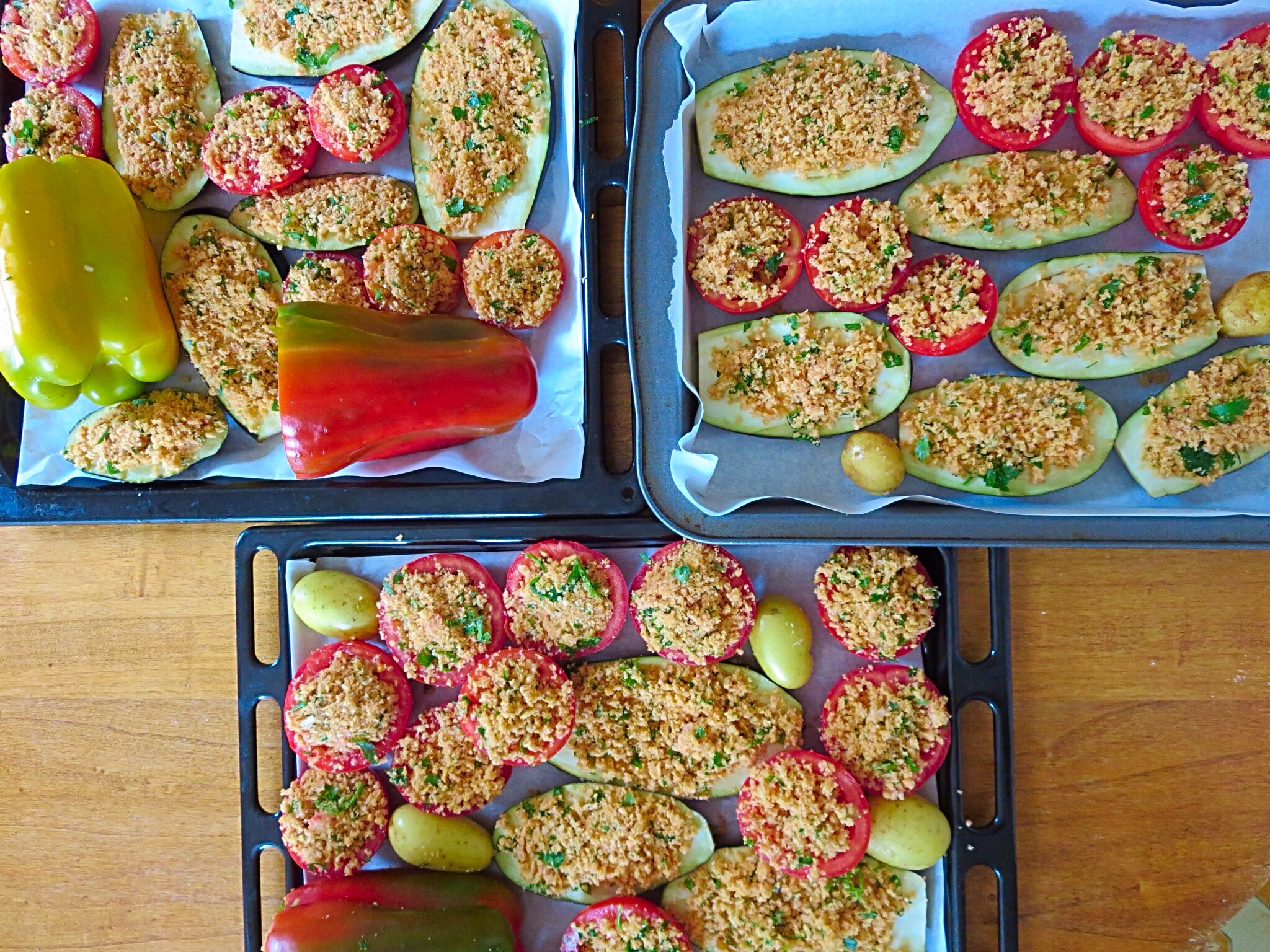 Here are the gratin ready for cooking. Costanza says it is important to mix the vegetables on each tray. This way the flavors blend creating depth to a simple dish. In the breadcrumbs (fatta in casa, certo!) we added the juice and seeds from the pomodori and a dash of salt.