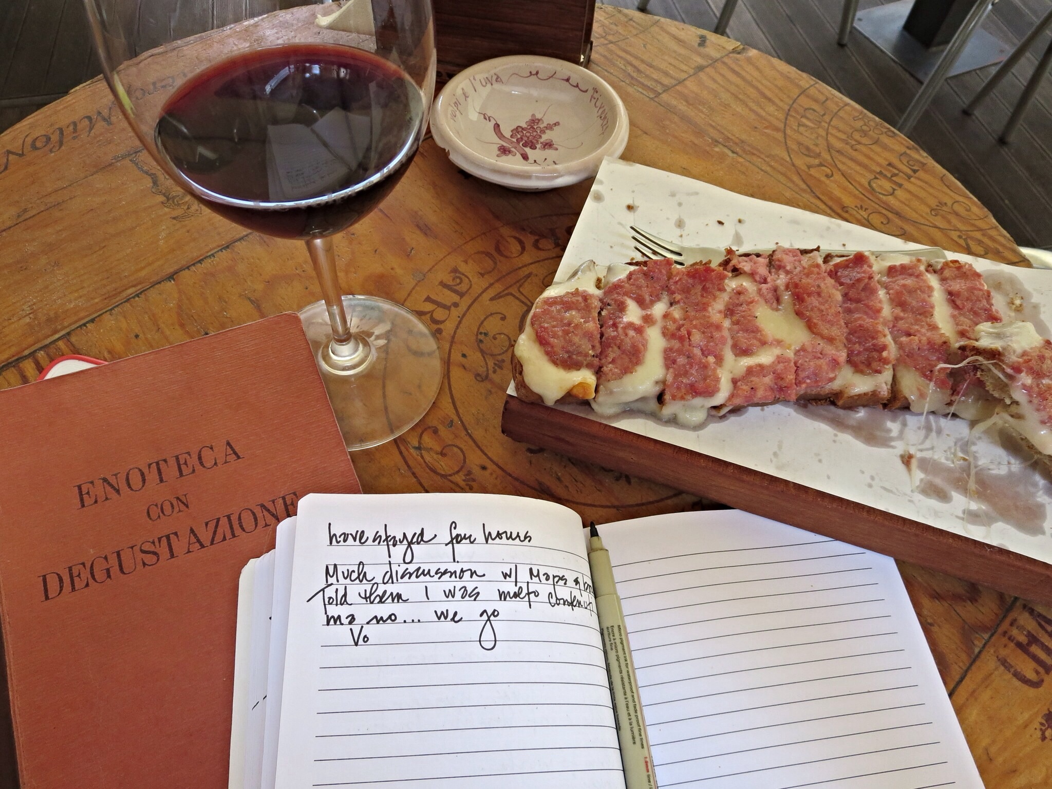 I wind my way back Oltrarno to La Volpe e l’Uva for a glass of wine and one of my favorite crostinis from the other night. I asked for the same wine, showing a photo I took to be clear, and cuz I’m living right, they had 1 bicchiere left. Perfetto!