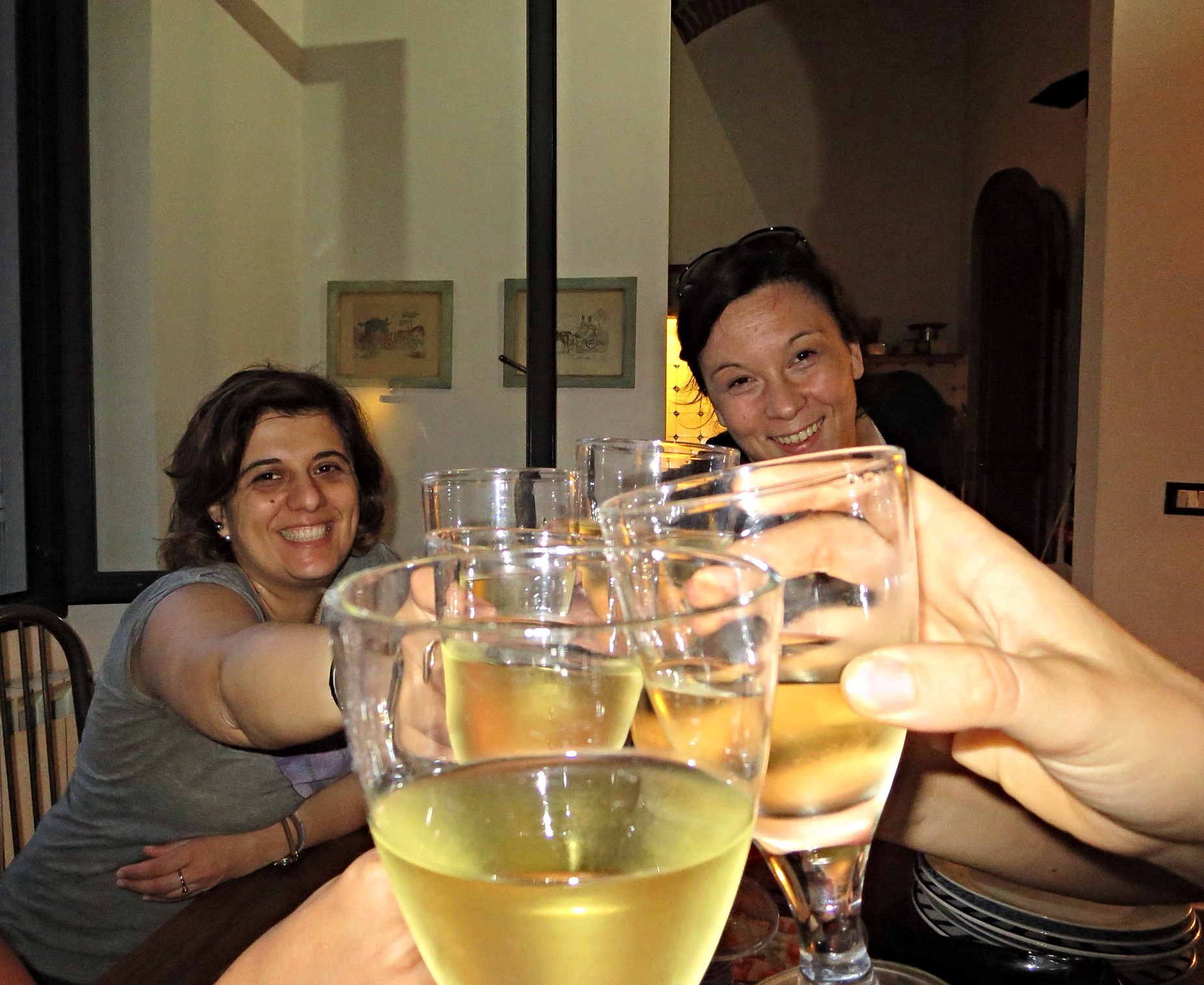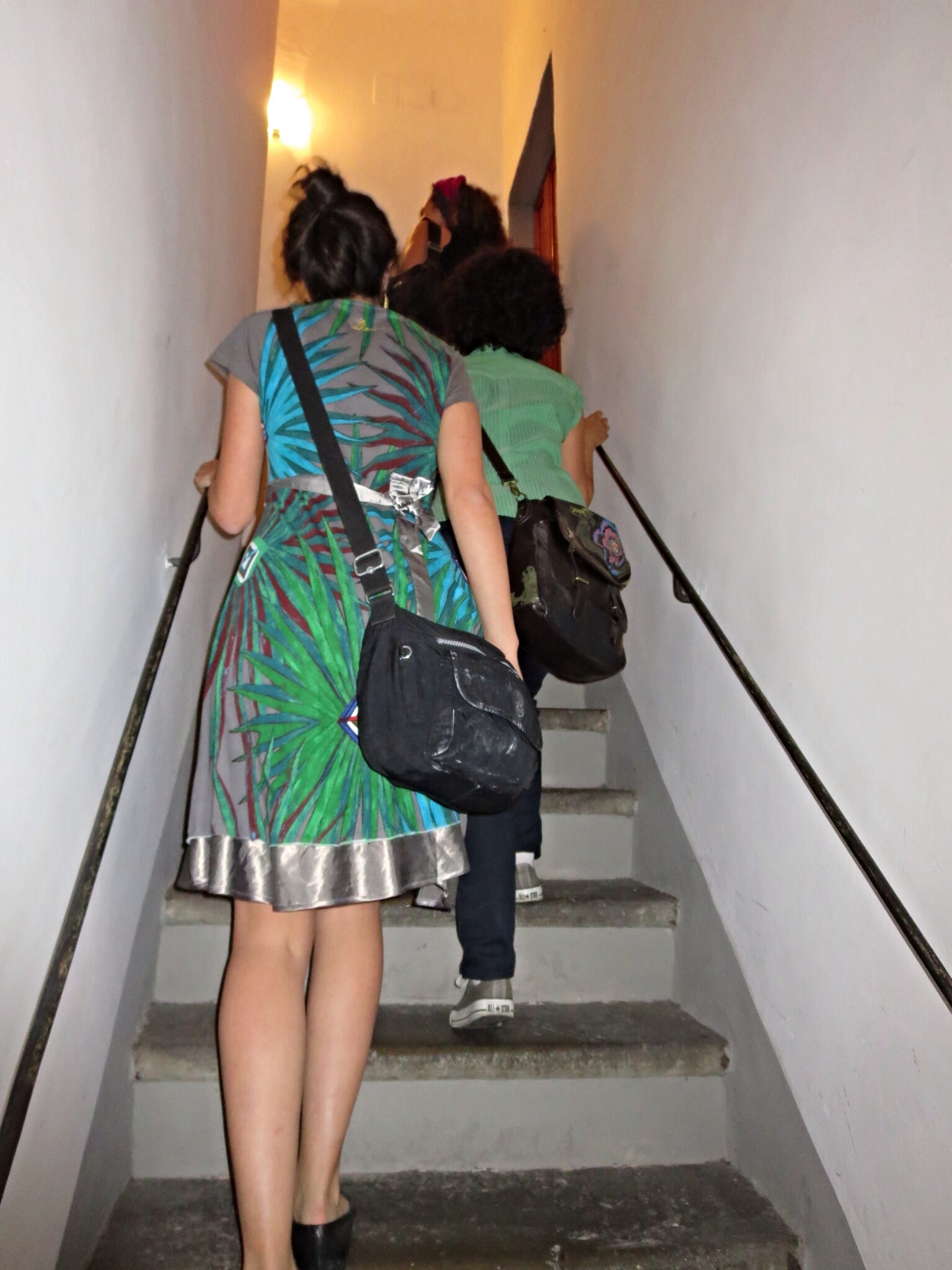 When I walk up, Angela and Elisa are waiting. Kiss/Kiss, Kiss/Kiss then Paola arrives, Kiss/Kiss. We chat just for a moment, then Paola tells us her two other friends are waiting at an appartamento just down the street. Andiamo!