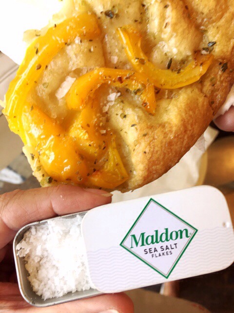 When we arrive at the market, Avery is waning a bit (we did not deviate from our course to the teatro to get a bite to eat…as we all know at this point…I have issues of wanting to get to a place before a designated time and then get…let’s see, what can I use instead of “nervous”…I am then reluctant to leave), so I quickly return to my little pane guy who I bought those beautiful small “figlio” schiacciata from the other day, grabbing Avery a couple while she snags a peach or two.
