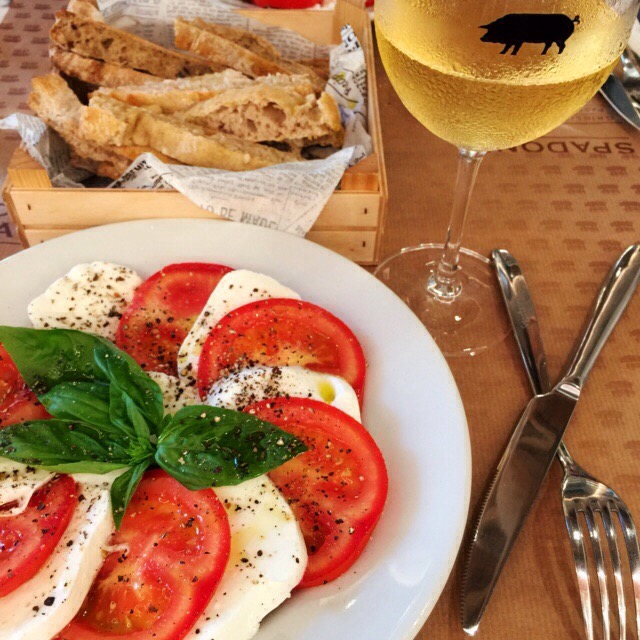I enjoy another fabulous, “light lunch” which I think just means no PAAsta. Instead I ask for caprese, bruschetta, salami and prosciutto e un bicchiere di vino bianco. It was ALL wonderful.